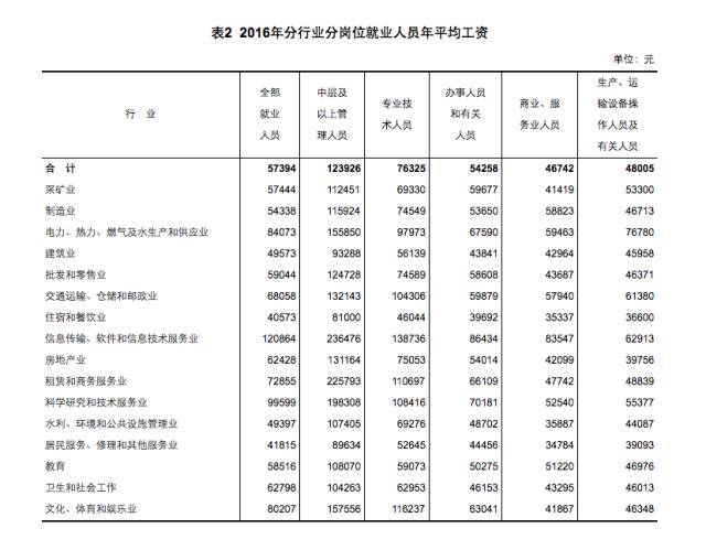 国家统计局27日发布消息,公布了2016年不同岗位的平均工资水平。数据显示,在经济运行缓中趋稳、稳中向好的背景下,全国城镇单位就业人员平均工资继续稳步增长。国家统计局对16个行业门类的约96万家企业法人单位调查显示,2016年,全部一套表平台被调查单位就业人员年平均工资为57394元,比2015年增长7.0%。