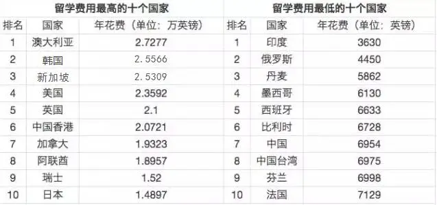 这个排名榜详细比较了各个国家的留学费用的排名!